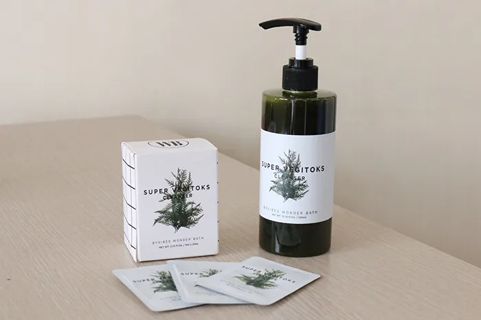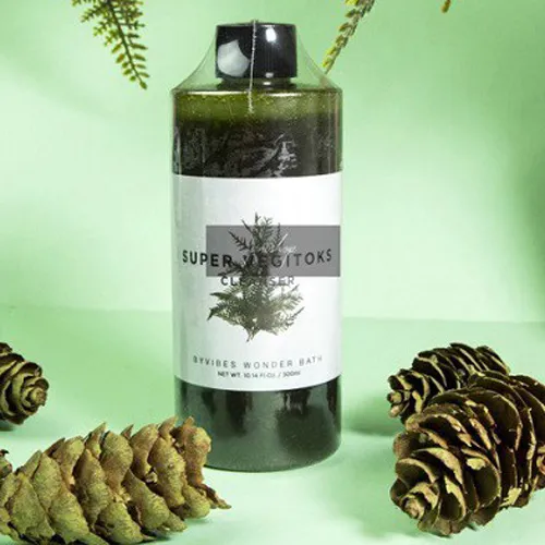 Chai đựng của sữa rửa mặt Super Vegitoks Cleanser được thiết kế tối giản với nhãn dán bằng giấy trắng cùng chữ màu đen